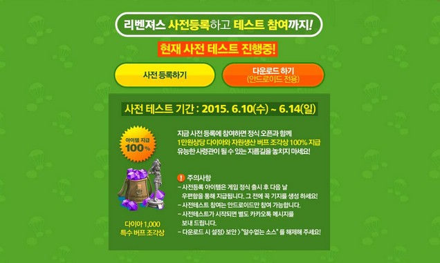 리벤져스가 현재 사전예약을 진행하고 있다고 합니다.개인적으로 모바일게임은 COC를 즐기고 있는데 COC와 비슷한 게임이등장한다는 소식에 관심있게 보고 있습니다 ㅋㅋㅋㅋ대기시간이 길어서 대기시간에 뭘 해야할까 고민을 많이 헀는데리벤져스가 출시하면 리벤져스를 하는것도나쁘지 않을듯합니다.클래시오브클랜보다는 좀더 세련된 느낌에 리벤져스메딕이 등장하며 영웅 시스템과 친구를 노예로 데려올수 있다는설정도 그렇고 재미있는 요소가 많을것 같습니다 ㅋㅋㅋ사전예약을 완료 후 게임이 출시되기를 기다리고 있는데이 시간이 제일 긴것 같습니다 ㅋㅋㅋㅋ사전예약 아이템으로 빠르게 업그레이드 해야겠군요 ㅋㅋㅋ
