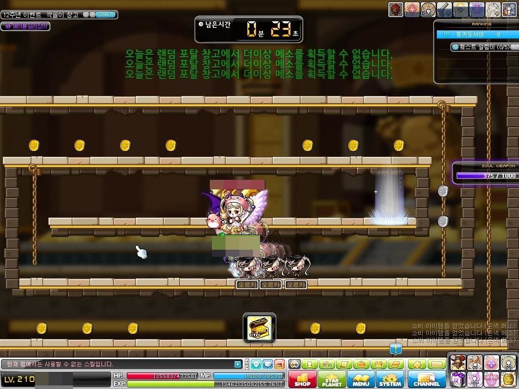 •  유저 개발 컨텐츠 동전피하기!!!! 실제는 동전먹는 컨텐츠지만...알게 뭔가요!! 재밌으면 그만이죠 이번 업데이트는 신규랑 복귀유저에게는 개꿀일거 같은데요메소 모으기도 쏠쏠하고 이전에 먹지 주년 아이템도 먹을 수 있고...근데 그게 아니라도 나름 재미는 있더라고요 달리는 재미도 쏠솔하고 1, 2등 먹는 재미로 해도 되고 아니면 동정피하기를 해도 되고ㅋㅋㅋㅋㅋ   나름 재미 붙여서 마을 포탈마다 다니면서 하고 있어요ㅋㅋㅋ매일 8번씩은 꼭 하는 듯사실, 코인도 뭐아야 하긴 하고요 그래도 이제 슬슬 다 모아갑니다