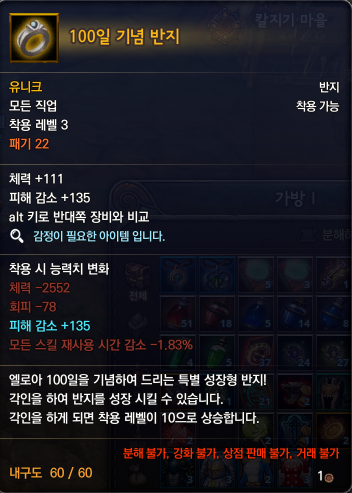• 뭔가 뿌듯하다 맨날 짱개 양산게임만 나오다 간만에 할만한 MMORPG나와서그동안 재밌게 하고있었는데 벌써 100일이라니 ㅎㅎ반지 때깔도 이쁜게 아주 마음에듬 무려 노란색임 !!ㅋㅋ그나저나 요즘 혼돈의균열 고스테이지 도전해보려고여기서 템파밍중인데 뭔가 돈이 아쉬워서 템 줏으면 자꾸 팔게되네 ^^;;;;이번 연휴때 맘먹고 파밍해서 고스테이지 솔플로 도전해봐야징 ㅎ
