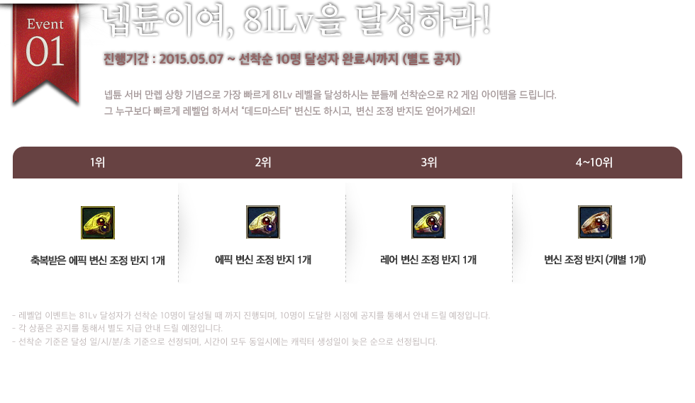 • 이번에 R2 넵튠서버 대대적인 업데이트를 했음..81Lv까지 렙제 풀리면서 81렙 먼저 달성하는 선착순으로 아이템 지급한다고 ㄷ ㄷ 그리고 81렙까지 렙제가 풀린만큼 넵튠급 강력한 변신이 가능해짐이외에도 다양한 이벤트 진행중이니 궁금하면 아래 링크 확인해보시길..ㄷㄷ[R2 이벤트 페이지]