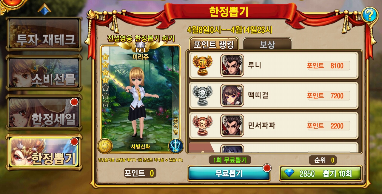 • 전설영웅 한정 뽑기로 이번에는 서방신화 미라쥬 등장 했음전설영웅 고급뽑기해도 미라쥬는 잘 나오지 않는데 한정 뽑기 무료뽑기로 한번 기대를 해봅니다.14일 총 6번 할 수 있으니 미라쥬 나왔으면