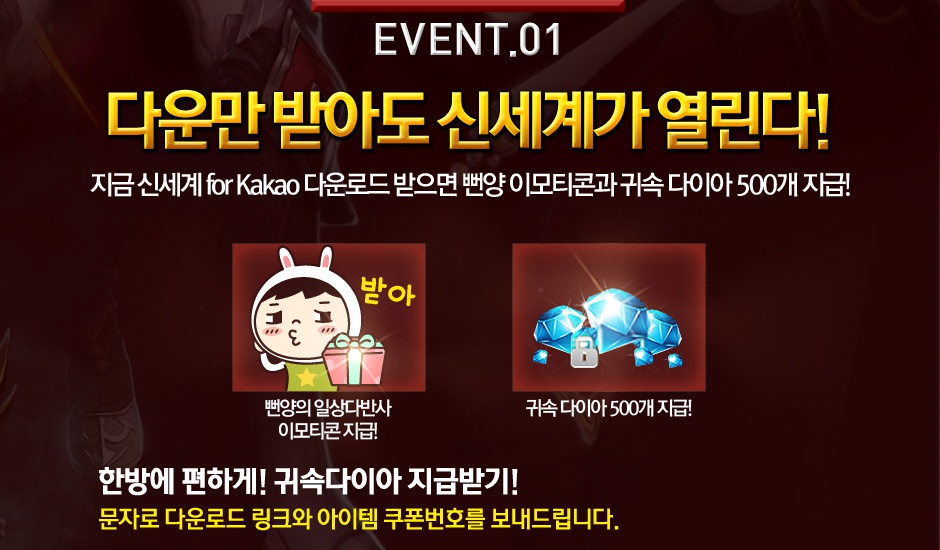 다운만 받아도 카톡 이모티콘이랑 귀속다이아 500개나 주는데게임좀 열심히하면 신세계상품권10만원이랑 문상 5천원권 챙길수 있음ㅋ아이템 이것저것 주는건 덤ㅋㅋ출시 초반이라 육성 이벤트도 있는데 해보니까 한 30분정도 하면 30렙넘음40렙도 금방일듯 이것도 스타벅스 아메리카노는 덤 ㅋㅋ카톡게임 특성상 아이템 꾸준히 겁나 퍼줄거같기도 하고 게임도 재밌는편이라꾸준히 할거같음