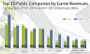 게임 시장 조사기업 Newzoo.com은 지난 30일(현지시간), 2014년 상반기 매출을 기반으로 한 전세계 게임업체 Top 25를 발표했다. 매출 1위 기업은 작년에 이어 중국의 텐센트가 2위와 압도적인 차이를 벌리며 선정되었다. 텐센트의 2014년 1분기 매출은 약 35억 달러(한화 약 3조 7천억 원)로, 전년 동기대비 40%(10억 달러) 증가했다2014.10.05 13:05