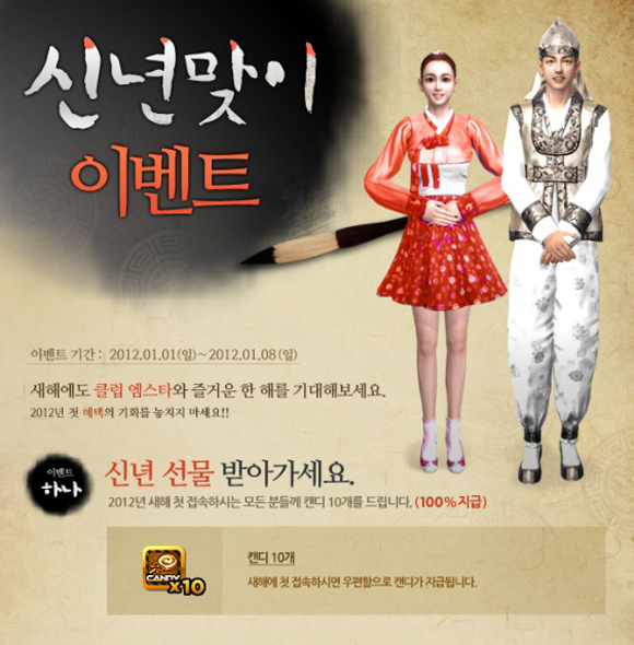먼저 온라인 댄스게임 `클럽 엠스타`에서는 오는 1월 1일부터 8일까지 게임에 첫 접속한 이용자들에게 게임 내 인기 아이템을 일괄 지급한다. 또 이벤트 기간 동안 아이템을 첫 구매한 이용자 전원에게 게임 내 인기 아이템을 지급하며, 추가로 캐릭터 닉네임 변경권과 성형 아이템 등의 혜택을 제공한다.