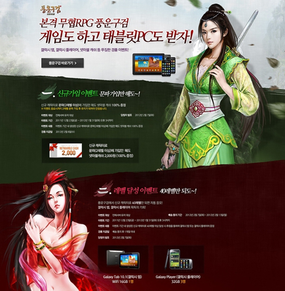 무협 웹RPG `풍운구검`은 갤럭시 탭, 갤럭시 플레이어, 넷마블 캐쉬 등 푸짐한 경품을 증정한다. 31일까지 신규 캐릭터를 생성해 2레벨 이상을 달성한 이용자들에게 넷마블 캐쉬를 지급하며, 40레벨 이상 도달 시 추첨을 통해 갤럭시 탭 또는 갤럭시 플레이어를 경품으로 제공한다.