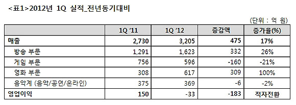 CJ E&M은 2012년 1분기 실적을 집계한 결과 영업손실 33억 원을 기록했다고 9일 공시했다. 전년동기대비 매출은 17% 증가했으나 영업손익은 적자로 전환했다.