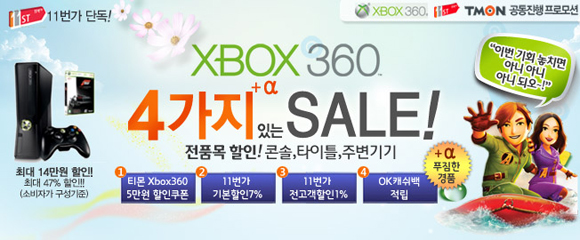 이번 프로모션은 5월 29일부터 31일까지 3일간 진행되며, 티몬에서 Xbox360 할인쿠폰을 구매한 후 11번가에서 Xbox360 콘솔 및 타이틀, 그리고 주변기기에까지 적용이 가능하다. 티몬에서는 콘솔에 적용 가능한 5만원권을 2만원에 구매가 가능하며, 타이틀 및 주변기기에 적용할 수 있는 2만원권을 1만원에 구매할 수 있다.