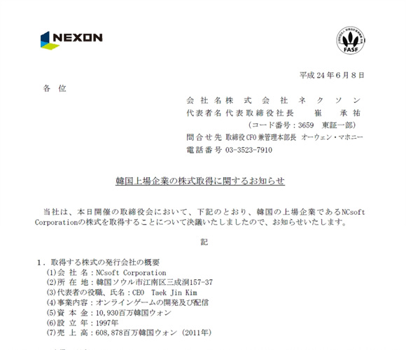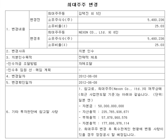 넥슨이 도쿄 증권 거래소에 공시한 내용