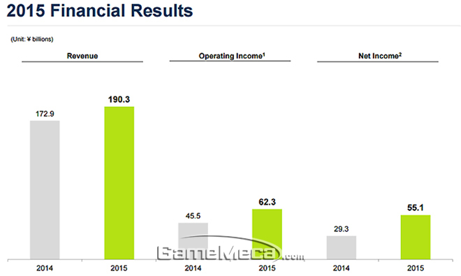 넥슨은 10일, 자사의 2015년 연간실적 및 4분기 실적을 공개했다. 지난 한 해 동안 넥슨은 매출 1,902억 6,300만 엔(한화로 1조 8,086억 원), 영업이익과 순이익은 각각 622억 9,000만 엔(한화로 5,921억 원), 551억 3,200만 엔(한화로 5,241억 원)을 기록했다. 2014년보다 매출은 10.06%, 영업이익과 순이익은 36.92%, 88.05% 늘어난 수치다. 적용 환율은 100엔 당 950.6원이다.