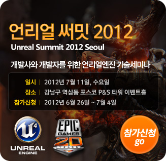 에픽게임스는 오는 7월 9일부터 11일까지 서울 역삼동 포스코 P&S 타워 이벤트홀에서 언리얼 엔진 기술 세미나인 `언리얼 써밋 2012 서울(Unreal Summit 2012 Seoul` 을 개최한다고 밝혔다.