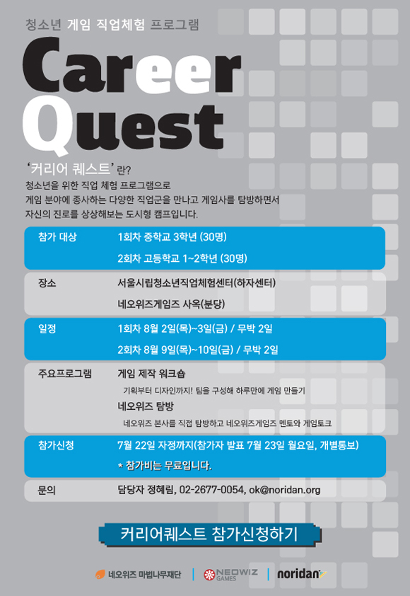 네오위즈 마법나무재단 홍승아 국장은 “청소년들이 직업 체험 활동을 통해 미래를 그려나갈 수 있도록 `커리어퀘스트`를 개최하고 있다. 막연하게만 상상하던 게임 직업에 대해 알아볼 수 있는 기회인 만큼, 많은 청소년들의 적극적인 참여를 기대한다”고 밝혔다.