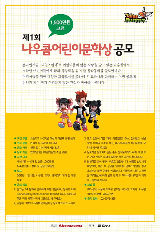 나우콤 어린이 문학상의 최종 수상작은 심사를 통해 11월 15일 발표 될 예정이며, 자세한 사항은 테일즈런너(www.talesrunner.com)와 교학사(www.kyohak.co.kr) 홈페이지에서 확인할 수 있다.