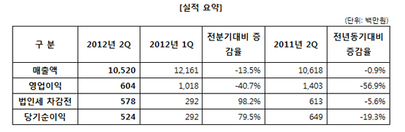 이는 전년동기대비 매출, 영업이익, 당기순이익은 각 0.9%, 56.9%, 19.3% 감소했고, 전분기대비 매출액과 영업이익은 각 13.5%, 40.7% 감소했으나 당기순이익은 79.5% 대폭 상승한 수치다.
