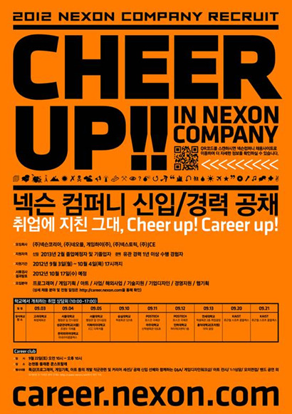 게임하이와 네오플, 넥스토릭, 넥슨, JCE 등 넥슨 컴퍼니 5개사는 ‘치어 업(Cheer Up)’을 주제로 2012년 하반기 신입/경력사원 공개채용을 시작한다고 3일 밝혔다.