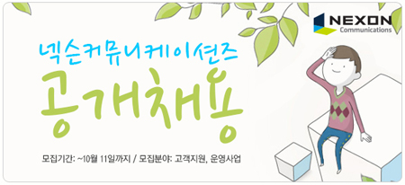 넥슨커뮤니케이션즈가 첫 번째 신입사원 공개채용을 실시한다. 넥슨커뮤니케이션즈는 넥슨의 자회사로, 게임 고객지원 상담 시스템을 구축하고 고객지원센터를 운영하는 온라인 게임 운영 전문기업이다.