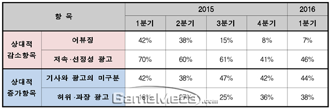 인터넷신문위원회는 31일(목), 2016년 1분기 기사 및 광고에 대한 자율 심의 활동 결과를 밝혔다. 이에 따르면 기사의 부당한 반복 전송(이하 어뷰징) 및 선정성 광고 등의 상대적 비중은 줄고 기사와 광고의 미구분, 허위‧과장 광고의 비중은 상대적으로 늘어났다.