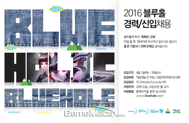 블루홀이 7일(목), 2016년도 상반기 신입 및 경력 공개 채용을 실시한다.