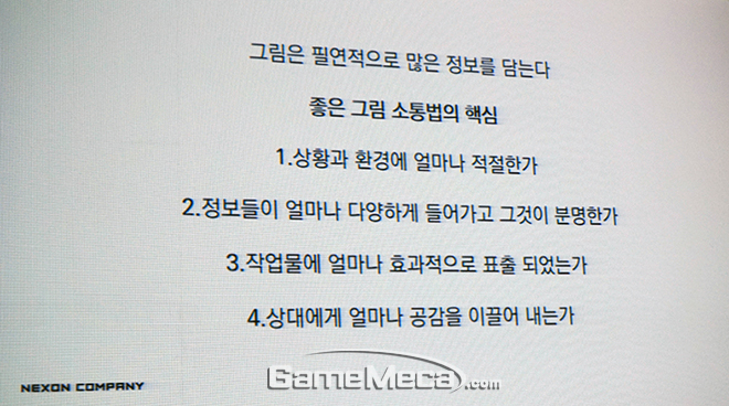 김 AD는 “누구보다 잘 그리고 싶다는 열정이 넘치는 사람이라면, 게임 원화가 일이 답답하고 속상할 것이다. 처음에는 결정권이 없고, 단지 기획자가 제시한 설정에 맞춰 이미지를 그려내야 한다. 그림이 통과되지 않으면 계속 수정해야 한다. 내가 보기에는 잘 나온 그림인데, 게임과 맞지 않다고 바꿔달라는 이야기도 수없이 들을 것이다. 그래서 필요한 게 그림을 통한 소통 방법이다”고 말했다.