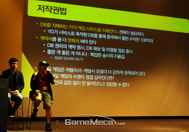 강연 현장에서 강조한 것은 딱 하나다. ‘DB 권리를 명시한 계약서를 명확하게 써야 한다는 것이다. 넥슨 이홍우 실장은 “DB를 지배하는 자가 게임 서비스를 지배한다. 와이디온라인이 중국에서 축적한 DB를 퍼블리셔에 넘기며 100억 원에 달하는 수익을 올릴 수 있었던 이유는 DB를 와이디온라인이 쥐고 있었기 때문이다라며 게임 서비스를 종료하거나 이관할 때 DB를 둘러싼 분쟁이 종종 일어나기에 DB 권리를 명확하게 계약서에 명시하는 것이 필요하다라고 강조했다.
