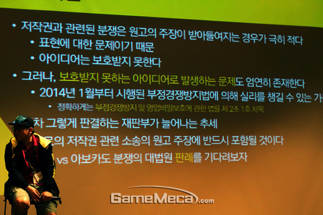 강연자들이 주목한 부분은 부정경쟁행위방해법(이하 부경법)’ 적용 범위가 게임과 같은 저작물까지 확대되었다는 것이다. 여기서 부경법이란 타인의 성과를 무단 도용해 상대의 경제적 이익을 침해하는 것을 금지하는 법으로 지난 2014 1월에 시행됐다. 초기에는 가방이나 아이스크림과 같은 공산품에만 적용되던 이 법이 이제는 저작물까지 확대되어 지적재산권을 보호받을 수 있는 여지가 생긴 것이다.