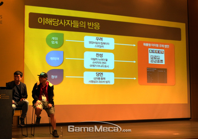 이에 대해 김관중 IP 팀장은 법을 막기 위한 업계의 적극적인 자율규제참여가 필요함을 강조했다. 김 팀장은 기존에는 정부와 게임사, 유저가 대결했다면 이제는 게임업계와 유저가 충돌하도록 유도하는 전략을 사용하는 것으로 보인다라며 규제의 관점과 방향도 다양해진만큼 업계 역시 무조건 규제에 반대하는 것이 아니라 자율규제로 풀어갈 방법을 고민해볼 때다라고 전했다.