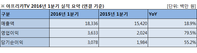 아프리카TV의 2016년 1분기 매출액은 183억 원으로 작년 동기 154억 원 대비 18.9% 상승했다. 영업이익 또한 36억 원으로 작년 동기 20억 원 대비 79.5% 올랐으며, 당기순이익은 30억 원으로 작년 동기 20억 원 대비 55.2% 가량 큰 폭으로 뛰었다. 이는 꾸준한 콘텐츠 카테고리 확장 및 영업 레버리지 효과 확대가 호재로 작용한 것으로 보인다.