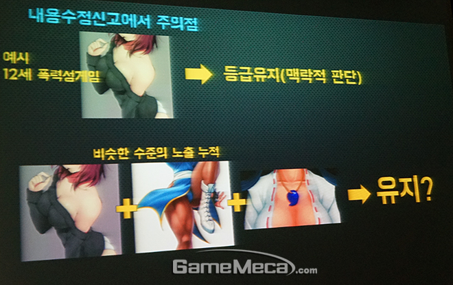 왕 팀장은 “처음 받은 등급을 기준으로 콘텐츠 업데이트를 하는 게 좋다. 출시 전 15세 이용가 등급을 받았다고 해서, 그 등급이 영속적이지는 않다. 온라인이나 모바일게임은 계속 업데이트가 있는데 할 때마다 내용수정신고를 해야 한다. 요 사이 여성 캐릭터 노출도로 아슬아슬하게 외줄타기를 하는 게임사가 많다. 심지어 내용수정신고 과정에서 게임과 다른 일러스트를 자료로 제출하는 곳도 있다. 이 경우 '재심의'를 통과했다고 해도 사후 모니터링에 걸리면 다시 '재심의' 절차를 진행해야 하는 번거로움이 있다. 따라서 가급적 캐릭터가 앞으로 추가될 옷을 입은 모습을 첨부하거나 실제 서비스에 들어가는 일러스트를 제공하길 바란다”고 설명했다.