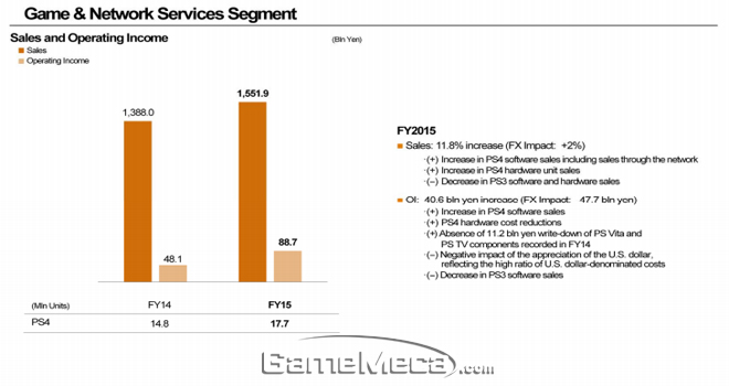 2015년 회계연도 실적에 대해 소니는 영업이익은 2007년 회계연도 이후 8년 만에 역대 최대 규모를 달성했으며, 순이익은 2012년 후 3년 만에 흑자전환에 성공했다고 설명했다. 소니의 실적개선을 이끈 큰 축은 '게임 사업'에 있다. 2015년 회계연도 기준 소니는 게임 및 네트워크 서비스 사업에서 매출 1조 5519억 엔, 영업이익 887억 엔을 달성했다. 매출은 2014년 회계연도보다 11.8% 늘었으며 영업이익 역시 406억 엔이 증가한 수치다.
