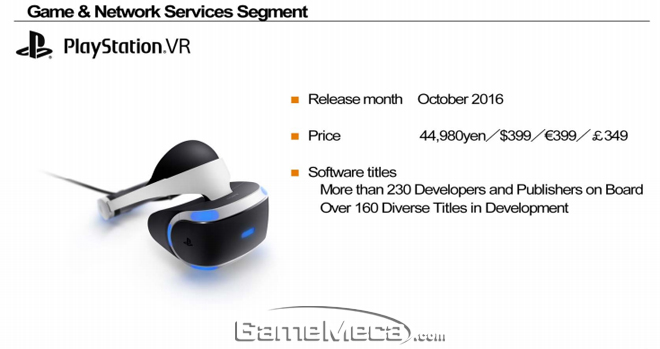 마지막으로 2016년에 대한 전망을 들어볼 수 있었다. 소니는 일단 보수적인 입장을 드러냈다. 2015년과 마찬가지로 PS4 1,770만 대 판매를 목표로 하고 있으나 구마모토 지진 여파로 부품 수급에 제한이 걸린 점을 고려해야 된다는 것이다. 즉, 지진 여파가 PS4 생산에 어떠한 영향을 미칠 것인가를 분석해봐야 한다는 입장이다. 이와 함께 소니가 어필한 다른 부분은 VR이다. 오는 10월, PS4 전용 가상현실 헤드셋 'PS VR'이 정식 출시되는 것이다. 소니는 약 230곳 이상의 파트너사와 함께 160종 이상의 VR 타이틀을 개발 중이라 어필했다.