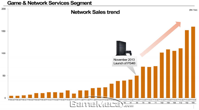 또 하나 주목할 점은 PSN을 통한 온라인 콘텐츠 매출 증가다. PS4가 2013년 11월에 출시된 후 네트워크 매출 역시 급격히 성장해 2015년 회계연도 4분기(2015년 9월부터 2015년 12월까지) 매출이 1,600억 엔에 달했다. PS4 출시 당시 매출이었던 500억 엔과 비교하면 3배 이상 증가한 것이다.