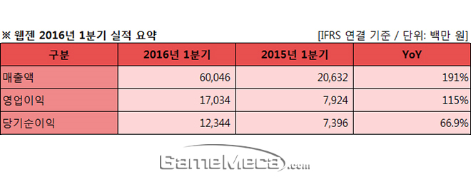웹젠은 4일(수), 자사의 2016년 1분기 실적을 발표했다. 이에 따르면 1분기 총 매출은 600억 원으로 전년 동기 206억 원 대비 191% 상승했으며, 영업이익은 170억 원으로 전년 동기 79억 원 대비 115% 증가했다. 당기순이익 또한 123억 원으로 전년 동기 74억 원에 비해 66.9% 가량 올랐다.