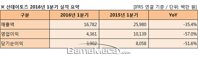 선데이토즈는 9일(월), 자사의 2016년 1분기 실적을 발표했다. 이에 따르면 1분기 총 매출은 168억 원으로 전년 동기 260억 원 대비 35.4% 감소했으며, 영업이익은 44억 원으로 전년 동기 101억 원 대비 57% 하락했다. 당기순이익 또한 39억 원으로 전년 동기 81억 원에 비해 51.6% 가량 떨어졌다.