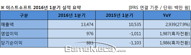 이스트소프트는 9일(월), 자사의 2016년 1분기 실적을 발표했다. 이에 따르면 1분기 총 매출은 135억 원으로 전년 동기 105억 원 대비 27.9% 증가했으며, 영업이익과 당기순이익 또한 각각 9억7,600만 원과 8억8,300만 원으로 전년 동기 대비 흑자 전환에 성공했다.