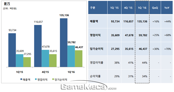 컴투스가 2016년 1분기 매출 1,351억, 영업이익 598억으로 사상 최대 분기 실적을 기록했다.