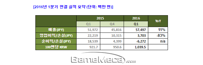 넥슨은 5월 12일, 자사의 2016년 1분기 실적을 발표했다. 이번 분기에 넥슨은 매출 574억 9,700만 엔(한화로 5,977억 원), 영업이익 37억 300만 엔(한화로 385억 원), 순손실 62억 7,200만 엔(한화로 -652억 원)을 기록했다. 매출은 2015년 1분기보다 11% 증가하며 역대 최고를 기록했으나 영업이익은 83% 감소했으며, 순이익은 적자 전환했다.