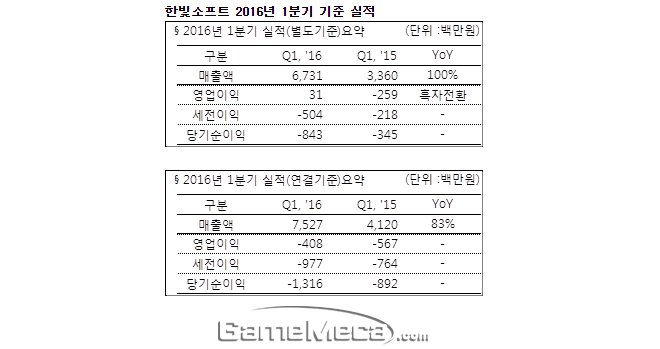 다만 한빛소프트 별도로는 매출 67억 3,100만 원, 영업이익 3,100만 원을 달성했다. 매출은 2015년 1분기보다 100% 늘었으며 영업이익은 흑자전환했다.