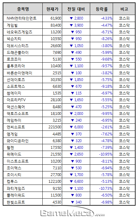 앞서 언급한 게임주 외에도 전반적으로 주가가 떨어지는 흐름이 강했다. 아프리카TV, NHN엔터테인먼트, 바른손이앤에이, 엔씨소프트, 드래곤플라이, 컴투스, 조이시티, 게임빌, 데브시스터즈, 선데이토즈, 와이디온라인 등이 전 거래일보다 낮은 주가를 기록했다. 게임주 28개 중 상승한 것은 단 하나도 없었다.