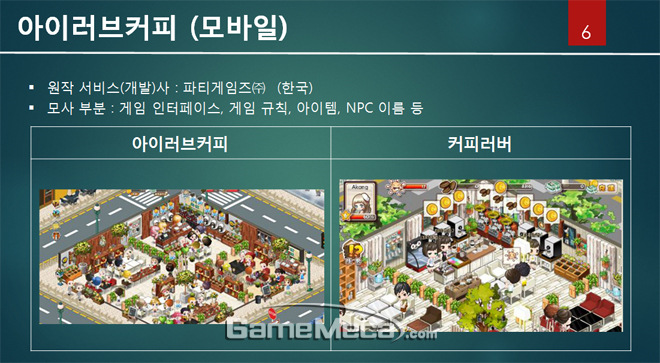 이와 함께 이동섭 의원은 중국 게임사의 무단 도용에 국산 게임사가 입는 피해가 심각함을 지적했다. 이 의원은 '던전앤파이터', '크레이지 아케이드 비엔비', '뮤 온라인' 등 온라인게임은 물론 '애니팡', '아이러브커피', '윈드러너', '스톤에이지' 등 모바일게임까지 피해 사례를 제시하며 문제의 심각성을 강조했다.