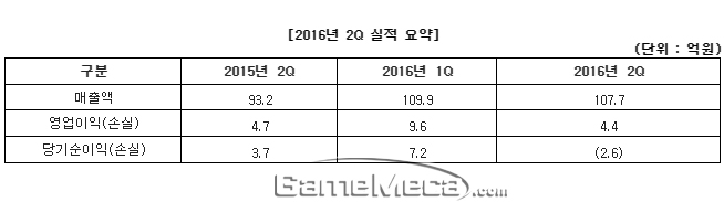 2015년 2분기보다 매출은 16% 증가, 영업이익은 6% 하락했다. 여기에 일부 모바일게임 서비스 종료로 무형자산이 감액되며 당기순이익은 적자전환했다.
