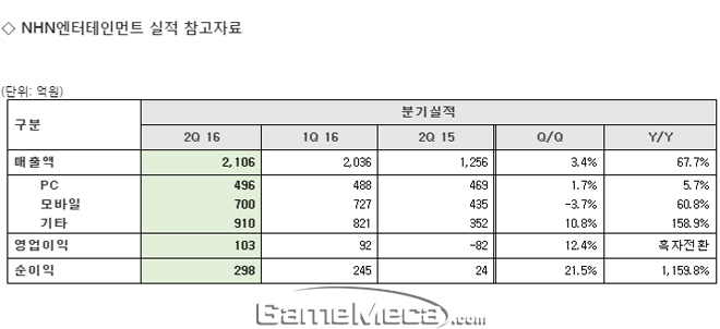 NHN엔터테인먼트가 12일, 2016년 2분기 실적을 발표했다. NHN엔터테인먼트의 2016년 2분기 매출은 2015년 2분기보다 67.7% 오른 2,106억원을 기록했고, 영업이익은 103억원, 당기순이익은 298억원으로 집계됐다. 전년 동기보다 영업이익은 흑자전환했으며, 당기순이익은 1,159.8% 올랐다.