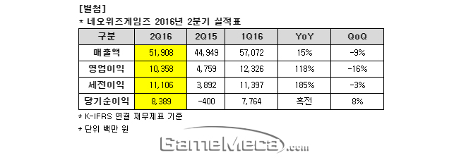 네오위즈게임즈는 12일 국제회계기준 연결 재무제표에 따른 2016년 2분기 실적을 발표했다. 2016년 2분기에 네오위즈게임즈는 매출 519억 원, 영업이익 104억 원, 당기순이익 84억 원을 달성했다. 2015년 2분기보다 매출은 15%, 영업이익은 118% 늘었으며, 당기순이익은 흑자전환했다.