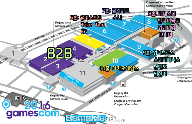 게임스컴 전시는 쾰른메세 총 11개관에 걸쳐 이루어진다. 관람객들이 다양한 게임을 만나고 즐기는 B2C ‘엔터테이먼트 에어리어’는 6, 7, 8, 9 10관이며, 게임스컴의 장점이자 사업적 교류의 장 B2B ‘비즈니스 에어리어’는 2, 3, 4관에 마련되어 있다. 특히, 지난해에 이어 이번에도 별도의 플랫폼 구분 없이 모든 전시관에 유력 게임업체들이 골고루 배치되어 한결 즐거운 관람이 가능할 것으로 기대된다.