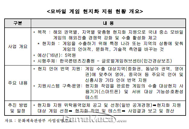 이어서 모바일게임산업 육성 추가 예산은 수출에 투입된다. 국내 게임에 언어 번역, 현지 테스트 등을 지원하는 '모바일게임 현지화 지원 사업'에 3억 5,000만 원을 더 투입하겠다는 것이다. 그러나 문체부 추경 예산안 중에는 해외에서 서비스되는 모바일게임 테스트, 운영, 마케팅 등을 지원해주는 '모바일게임 글로벌 퍼블리싱 사업'에 7억 원을 추가 편성한다는 계획이 있다. 다시 말해 해외에 나가는 모바일게임을 지원하는 사업이 2종이나 있는 것이다. 여기에 두 사업을 맡은 사업 주체 역시 글로벌게임허브센터로 동일하다.
