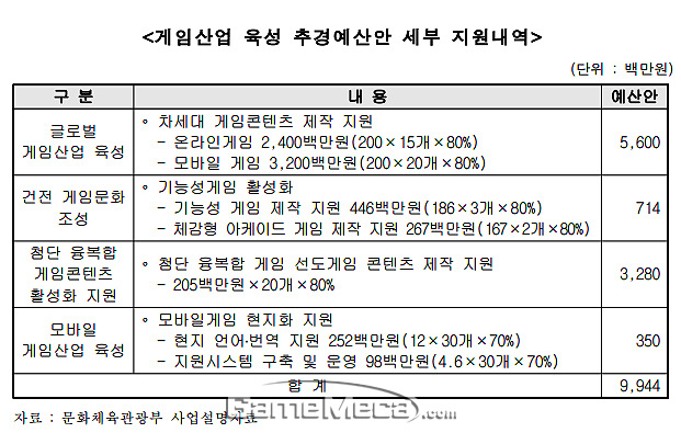 이 외에도 ▲글로벌 게임산업 육성에 56억 원 ▲건전 게임문화조성에 7억 1,400만 원 ▲모바일게임산업 육성에 3억 5,000만 원이 각각 추가됐다. 이 중 모바일게임산업 육성을 제외한 두 사업 추경 목적은 '콘텐츠 제작 지원'이다. 글로벌 게임산업 육성은 ▲온라인게임에 24억 원 ▲모바일게임에 32억 원이 배정됐다. 대상 개발사 수는 35곳이다.