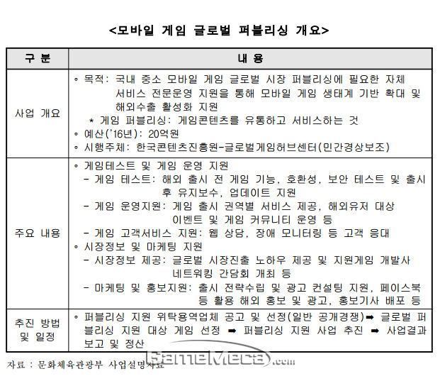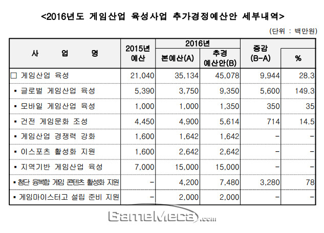 ▲ 2016년 게임산업 육성사업 추가경졍예산안 세부내역