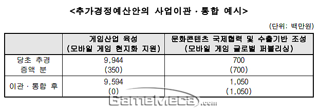 국회 예비심사검토보고서에는 '모바일게임 수출 촉진을 위하여 추경예산안을 편성하는 것 자체는 타당성이 있으나 유사∙중복 사업을 각각 세부 사업에 편성하는 것은 효율적이지 않다'는 내용이 포함되어 있다. 비슷한 사업에 예산을 나눠서 편성하지 말라는 것이다. 이에 두 사업에 각각 추가된 3억 5,000만 원과 7억 원을 합친 10억 5,000만 원을 게임을 비롯한 국산 콘텐츠 수출을 지원하는 '문화콘텐츠 국제협력 및 수출기반 조성'에 포함시키는 것이 어떠냐는 대안이 제시됐다.