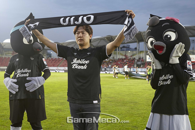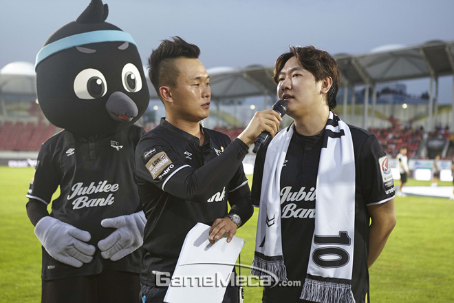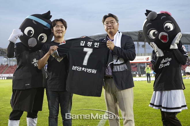 '피파 온라인 3' 프로게이머 김정민이 지난 17일, 성남FC 홈경기에 앞서 입단식을 가졌다. 김정민은 아시아 최초로 진행된 e스포츠 선수의 프로 스포츠 구단 입단이다.