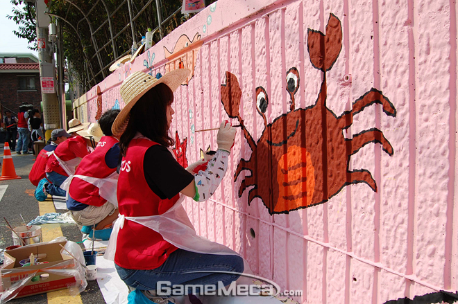 ▲ 담장에 귀엽고 친근한 캐릭터를 그려주는 '컴투게더' 단원 (사진제공: 컴투스)