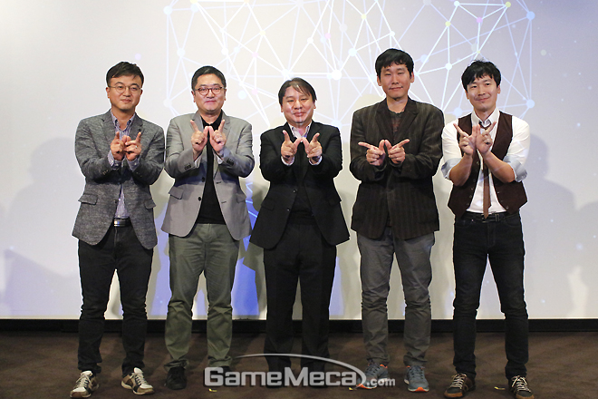 ▲ 행사에 자리한 주요 인사들. 왼쪽부터 웹젠 이진우 사업실장, 임형준 사업실장, 김태영 대표, 조준범 사업팀장, 정연국 사업팀장