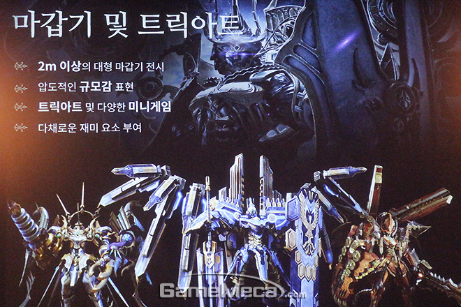 ‘아제라: 아이언하트’는 영상을 보여주는 대신 게임 속 메카닉이 직접 현실로 튀어나온다. 약 2m 이상의 전고를 자랑하는 ‘마갑기’ 조형물이 부스 양 옆에 호위대마냥 버티고 선다. 아울러 보는 이의 눈을 의심케 하는 트릭아트와 다양한 미니게임 덕분에 게임 시연을 기다리는 와중에도 지루할 틈이 없을 전망이다.